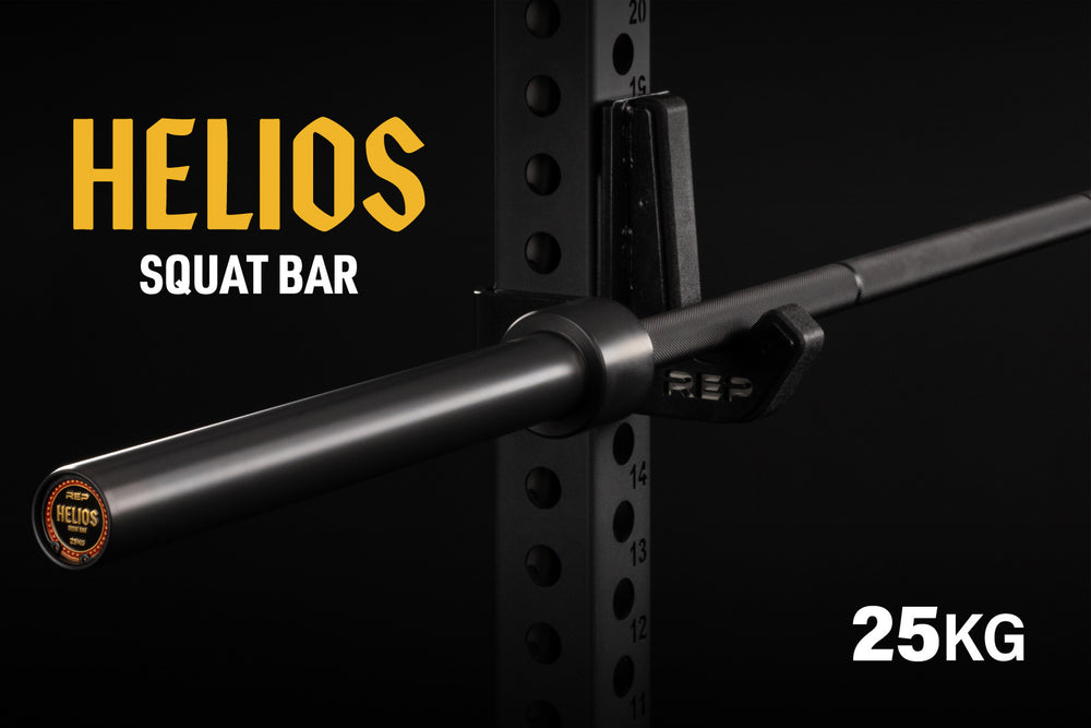 The Helios™ squat bar is a top-tier, specialty barbell designed specifically for squats. It features a longer length (94.5" or 7.9’) than a standard 20kg barbell (87.4" or 7.3’). This helps prevent the weight plates from hitting the power rack uprights while racking or unracking the bar. The squat bar’s shaft diameter is also larger, at 32mm, versus a standard powerlifting barbell, which is 29mm. The thicker diameter adds rigidity to the bar and minimizes whip/flex during heavy loads for a more stable squat. Due to the longer length and thicker shaft diameter, the Helios™ squat bar weighs in at 25kg (55lbs), which is 5kg (11lbs) more than a standard 20kg (44.1lbs) barbell.